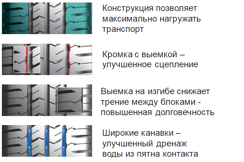 - Закрытые сплошные плечевые ребра повышают жесткость протектора, улучшая боковую устойчивость. Машина становится более стабильной при резких маневрах и точнее реагирует на рулевое управление.